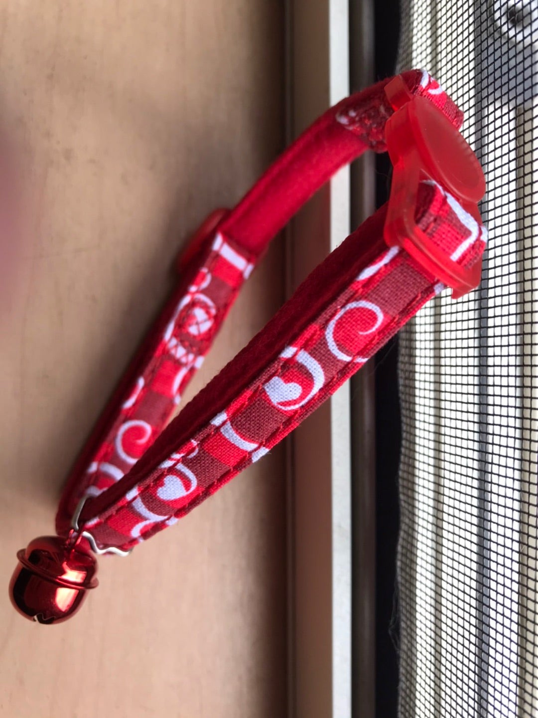 赤い鈴のついた赤い首輪をしています。