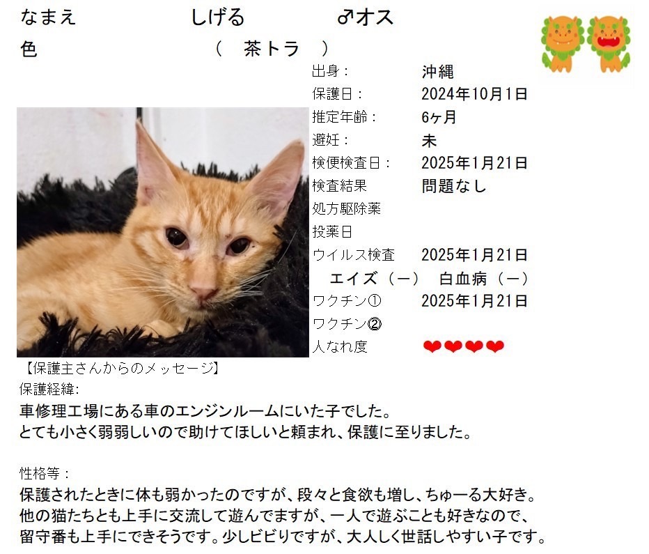 - <預かり中>預かりボランティアさんのお宅へいますので店舗にはいません。お問合せください。