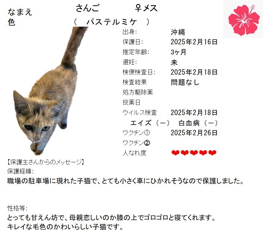 - <預かり中>預かりボランティアさんのお宅へいますので店舗にはいません。お問合せください。