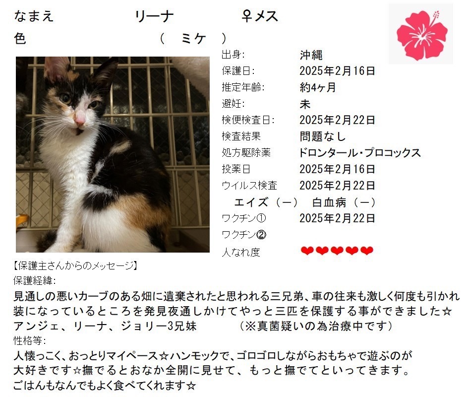 - <預かり中>預かりボランティアさんのお宅へいますので店舗にはいません。お問合せください。
