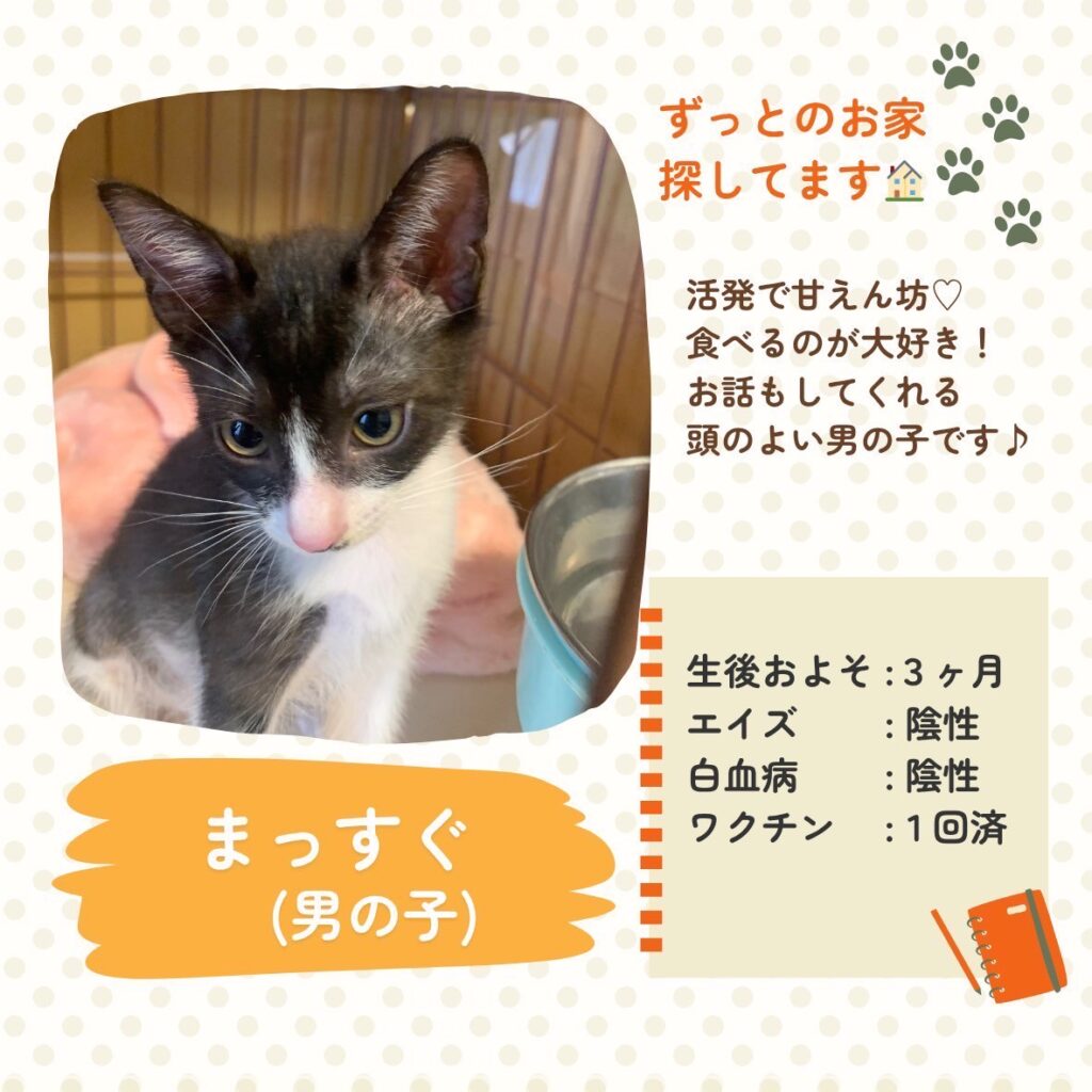 - <預かり中>預かりボランティアさんのお宅へいますので店舗にはいません。お問合せください。