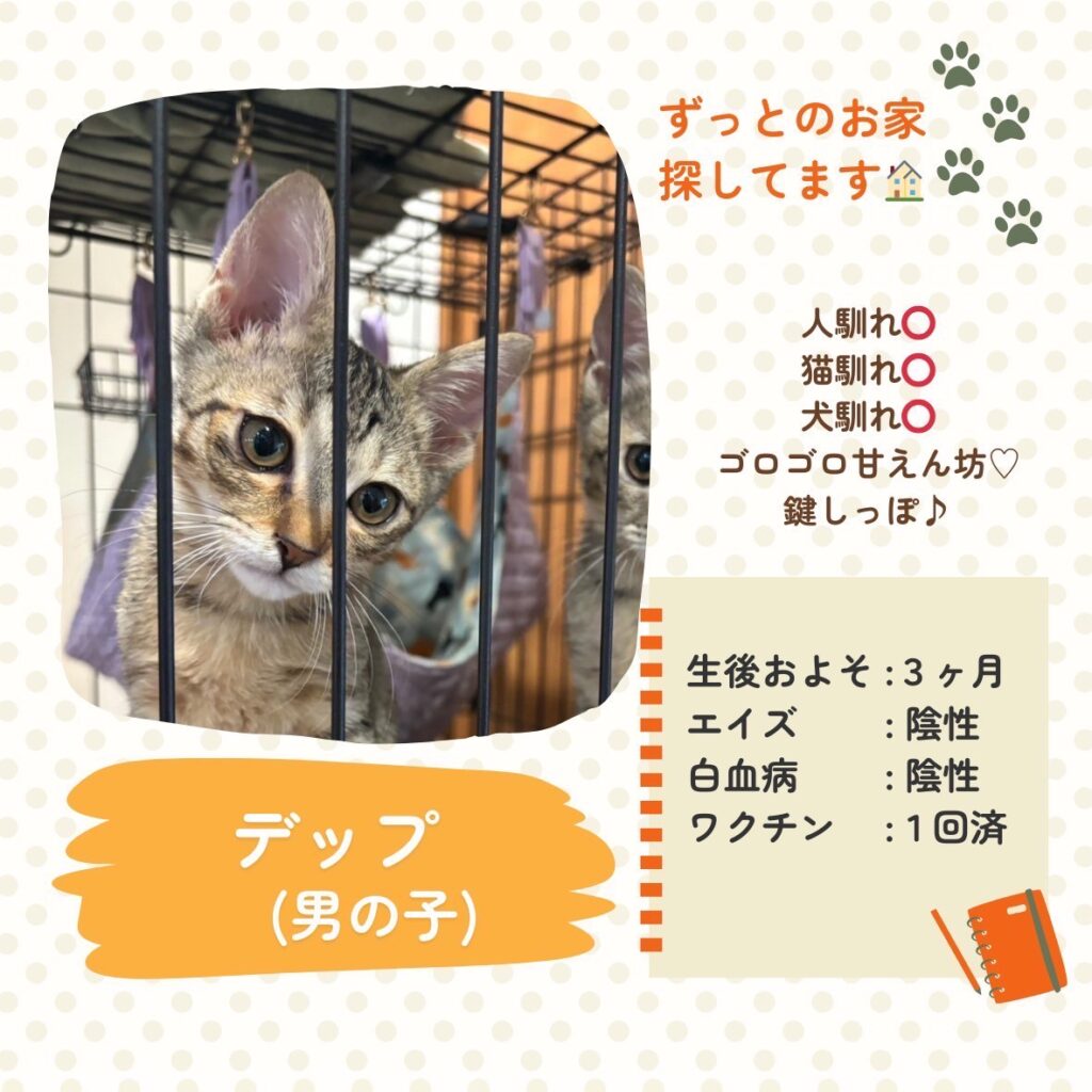 - <預かり中>預かりボランティアさんのお宅へいますので店舗にはいません。お問合せください。