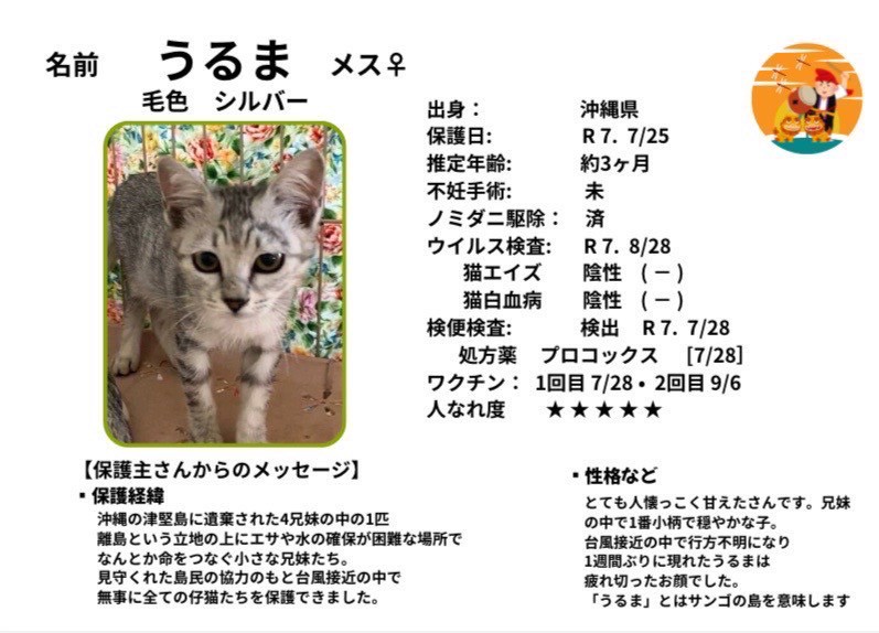 - <預かり中>預かりボランティアさんのお宅へいますので店舗にはいません。お問合せください。