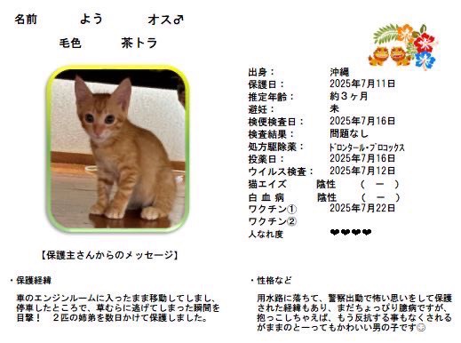 - <預かり中>預かりボランティアさんのお宅へいますので店舗にはいません。お問合せください。