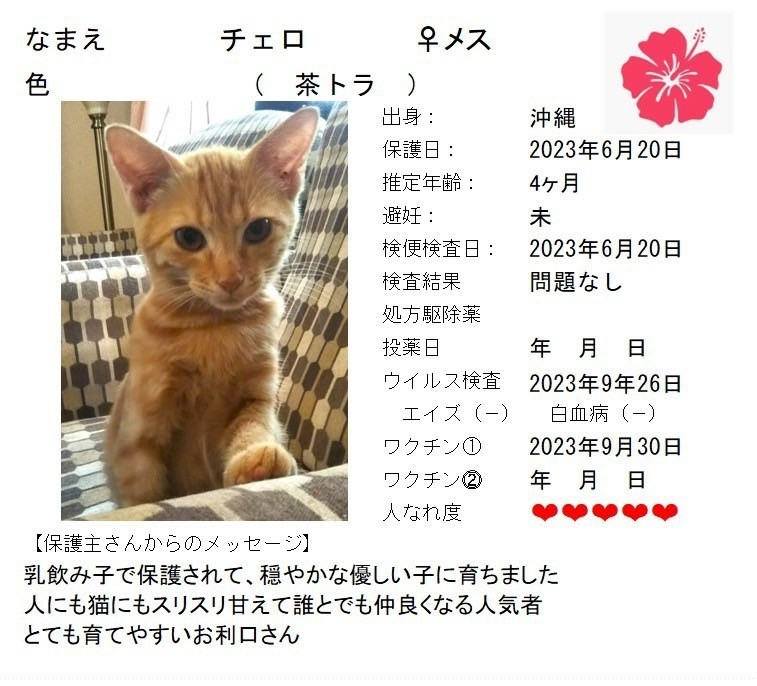 - <預かり中>預かりボランティアさんのお宅へいますので店舗にはいません。お問合せください。