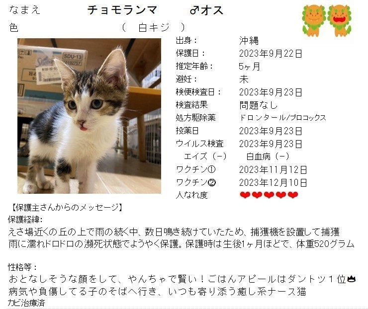 - 掲載されている猫はワクチン・ウイルス検査・避妊去勢など終えています。(子猫は掲載しておりません)